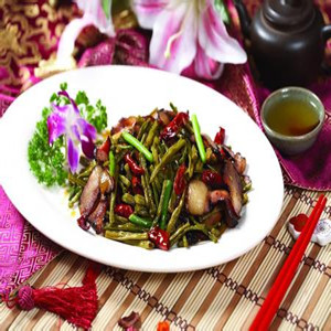 食材:干豇豆,酱油, 糖, 酒, 姜丝,鸡汤,胡萝卜丝,青辣椒丝,干辣椒,麻油,耗油