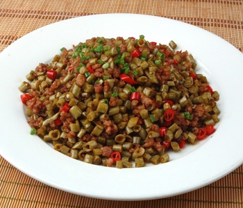 4、再加适量油烧热,下酸豆角粒炒香,将牛肉末回锅一起快速兜匀,加适量盐、生抽、鸡精、糖调味,勾薄芡,淋麻油,装碟上桌即可。