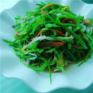 具体做法:把新鲜挑选的荷兰豆择去老筋洗净,胡萝卜去皮清洗干净,这个用法添加的胡萝卜是因为胡萝卜可以做成的凉拌荷兰豆红绿相间,卖相更好看。锅内水烧开后放入荷兰豆焯水。把焯过水的荷兰豆放入凉水中过凉备用。荷兰豆和胡萝卜切成丝后,把切好的丝放入小盆中,放入蒜末、香油、味精、盐、少许醋和糖。最后搅拌均匀就可以了。