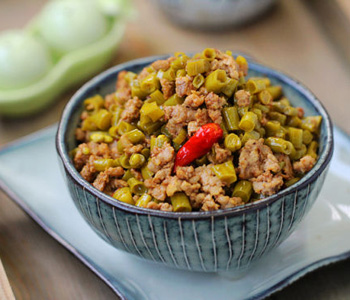 主料:酸豇豆适量、猪肉馅适量、干辣椒段适量、姜碎适量、葱白末适量