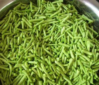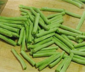 2、炒锅洗净置旺火上,放油烧至七成热,下豇豆,炸至皱皮时捞出,沥干油份待用。