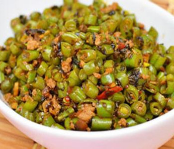 干煸豇豆的制作材料,主料:嫩豇豆400克,碎米芽菜半包(40克),绍酒1汤匙,酱油2汤匙,盐、味精、香油适量。 干煸豇豆的特色: 色泽翠绿,鲜咸爽口.入锅炸制,不宜太久、太干,以皱皮为度。 干煸豇豆的做法: