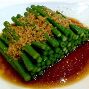 2、锅留底油,下干辣椒段、大蒜籽(切碎)用小火煸出香味,与炸好的豇豆及各种调味料拌匀即成。