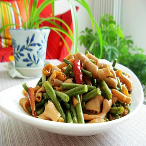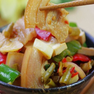 原料:酸豇豆、五花肉、小米椒、尖椒、花生油、食盐、酱油、鸡精、姜、蒜、料酒、小葱、白糖。
