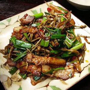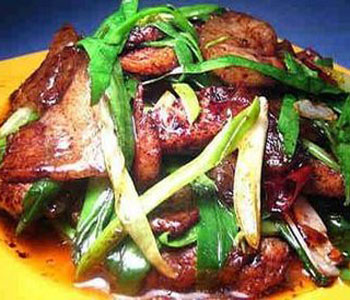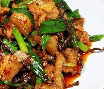 干豇豆回锅肉 这道菜的主要原料:五花肉带脆骨、干豇豆。它所需的配料有以下这些: 蒜苗、仔姜、蒜瓣、灯笼椒、花椒。同时它所要用到的调料有:老干妈、豆豉、豆瓣酱、白兰地、糖、鸡精。现在我们来说一说这道菜的具体做法吧。首先,五花肉用开水煮熟晾凉切片,干豆角泡发切小段,姜切丝,蒜切片,辣椒切圈,新鲜蒜苗切段备用;其次,锅热注油下豆瓣酱煸出红油,放姜,蒜干辣椒一起爆香,再放五花肉煸炒至微卷;然后,放老干妈一起炒匀,再放干豆角一起炒2分钟左右,放一点白兰地(白兰地倒入锅内,整个锅瞬间就冒起大火啦,小心别吓到);最后,加一点白糖,鸡精,最后放入蒜苗炒至断生即可。一步一步地来进行,做烹制的过程中我们要有足够的耐心,这样美味的菜肴才能够烹制成功。