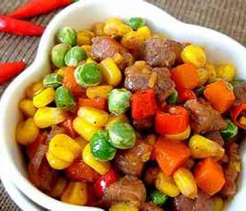 3、原锅留少许油再烧热,放入葱花、姜末、蒜末爆香,然后加入牛肉丁炒至变色,放入胡萝卜丁翻炒约3分钟,再调入白糖、醋、酱油、盐炒匀,用水淀粉勾芡,最后下入炸好的豌豆拌均匀,这样就可以了。