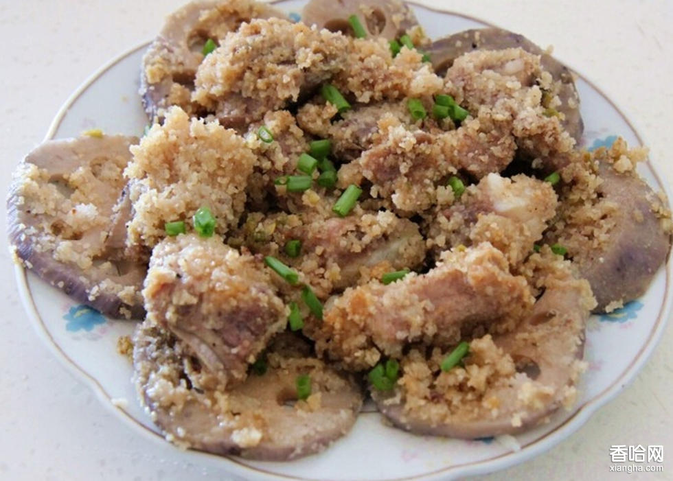 粉蒸莲藕,汉族小吃,选用荷塘老藕为主料,此菜粘糊而不沾齿,油润而不腻味。粉蒸莲藕,选用荷塘老藕为主料,其制法为将藕刮洗干净、去掉节的老藕分条剖开,然后把藕的剖面朝下,放在苫板上,用刀面拍破,切成一寸长,三分粗的条,盛入钵内,加姜末、精盐、味精少许一起拌匀,腌渍片刻。切三两肥肉丁拌入,再将腌渍好的藕,用生大米拌匀,放入笼屉内,用旺火蒸一刻钟后取出,盛入盘内,浇卤芡,淋香油,撒葱花即成。