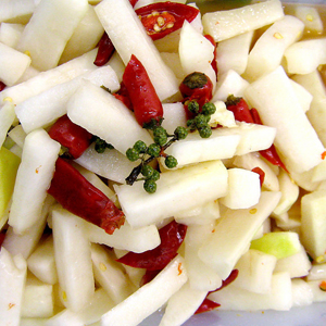 材料:白萝卜1个、盐适量、醋适量、白糖适量、姜适量、辣椒适量