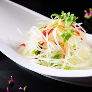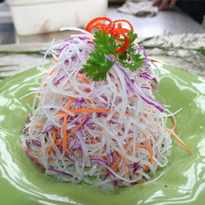1、将青萝卜洗净去皮,切成细丝,用凉开水洗净,沥干水分装盘。