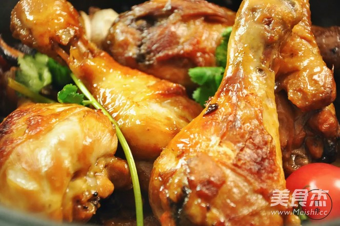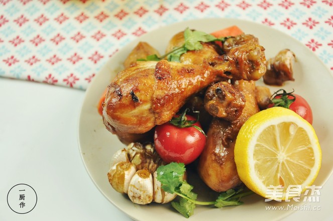 8.不打开锅盖的情况下,整锅一起放进预热好的烤箱,200度烤20分钟后取出,并将鸡腿翻面,再次放入烤箱,继续烤20分钟即可。