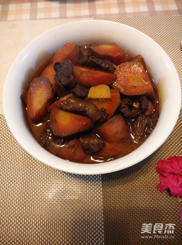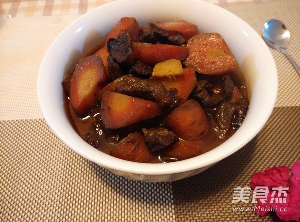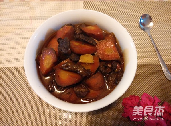 红萝卜甜甜甜,看到看到就过年。 主料 胡萝卜300克 牛腩600克 辅料 菜籽油3勺 盐5克 姜1块 五香粉2克 辣椒(红,尖,干)3个 花椒10粒 生抽5克 老抽2克 胡萝卜烧牛肉的做法 1.炒锅放油,放焯过水的牛腩块炒干水分 2.放姜,辣椒段,花椒粒炒 3.放生抽 4.老抽 5.加两大碗清水烧 6.胡萝卜功滚刀块 7.牛肉炖至60分钟时加萝卜块 8.再烧20分钟 9.水汁收快干时,放盐,五香粉,炒匀关火。 烹饪技巧 牛腩一定要炖得软烂才好吃,可以用压力锅压更方便快捷。