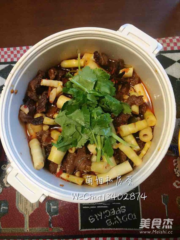 10.倒入笋子,大火烧开之后,小火慢炖,盖上锅盖。大约30~40分钟,时间取决于牛肉的软硬,30分钟之后可以取一块牛肉尝尝。