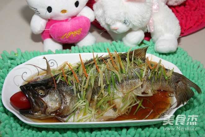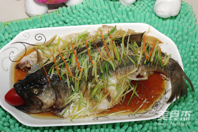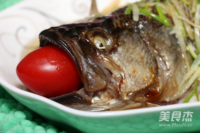 刀在鱼后背位置顺着鱼切开一道口子,好熟,而且不影响造型,不会烂掉。鱼不用煨,记得身下垫葱条、姜条,鱼身下透气才能熟透,水开锅后直接上屉蒸,大火两分钟,中火六七分钟,关火三五分钟,关火后多焖一会肉不会老又不会生,出锅时盘子里腥水倒掉!撒放葱丝姜丝,烧热油,一定烧开油,然后浇豉油放葱丝浇热油,塞红圣女果入鱼嘴,即成。