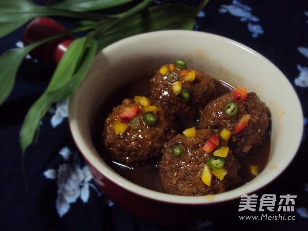 14.用盐、味精、老抽、白糖调汁,水淀粉勾芡,淋在丸子上,青红椒点缀就可以了