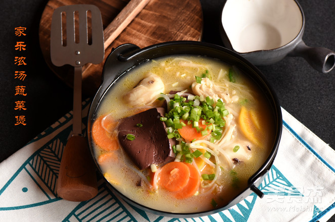 家乐浓汤宝是我刚结婚时最喜欢买的一款厨房调味品,因为味道醇香,原材料放心,所以家人都很喜欢。 主料 猪血200克 胡萝卜60克 红薯60克 豆芽60克 金针菇60克 辅料 食盐5克 色拉油适量 香葱20克 大蒜10克 水适量 家乐浓汤蔬菜煲的做法 1.锅中倒入适量色拉油 2.下入大蒜、胡萝卜和红薯片翻炒 3.加入适量水 4.倒入家乐浓汤宝两块 5.下入猪血 6.下入豆芽和 7.下入金针菇,煮熟即可出锅