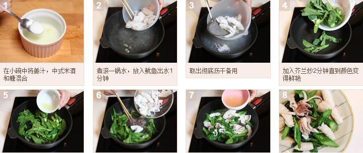 芥兰虾酱炒鲜鱿的材料:芥兰200克,新鲜鱿鱼2条约300克,鸡汤200mL,姜汁1汤匙,虾酱1汤匙,中式米酒1汤匙,糖1/2茶匙 芥兰虾酱炒鲜鱿的做法: 1. 将芥兰的茎叶分开,将茎滚刀切成中等长短的段。 2. 鱿鱼切成中等大小的块,并在表面划一些切口。 3. 在小碗中将姜汁,中式米酒和糖混合。 学做菜 4. 煮滚一锅水,放入鱿鱼出水1分钟,取出彻底沥干备用。 5. 在油锅内高火加热适量油,加入芥兰炒2分钟直到颜色变得鲜艳,加入步骤3的姜汁混合物继续翻炒。 6. 然后加入虾酱和鱿鱼搅匀。最后加入鸡汤(这会令芥兰的口感更加柔软)炒2分钟,即成。