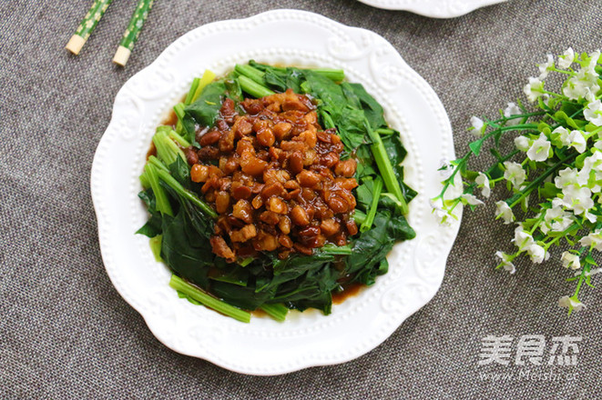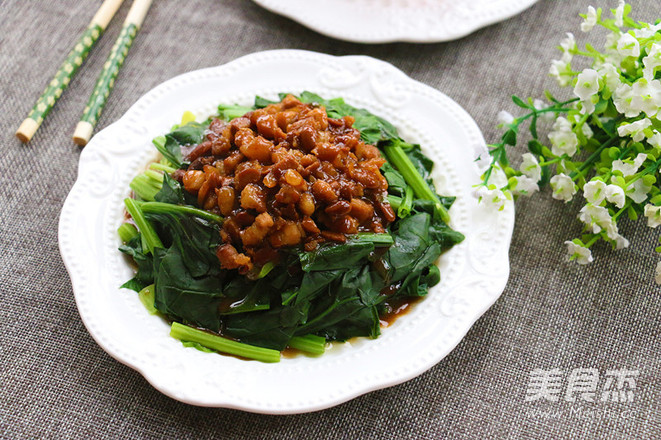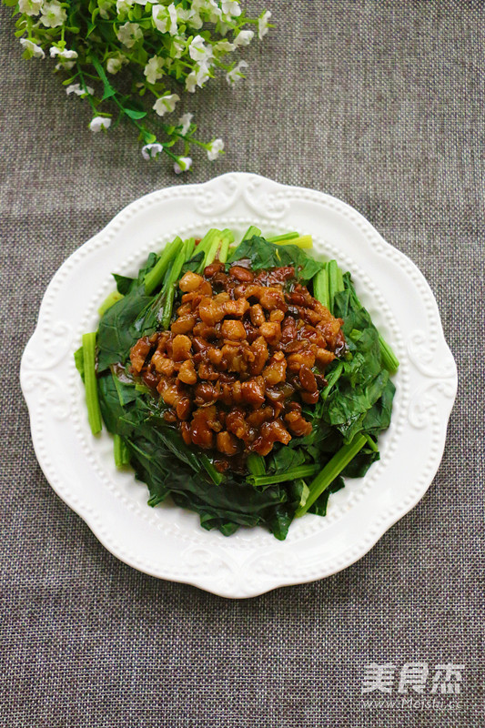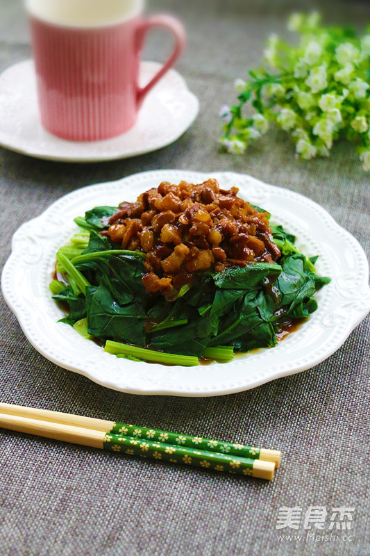 这道菜最初是在饭店吃到的,因为喜欢,回到家就自己操练起来,虽然与饭店味道稍稍有差,但也不错。毕竟我不用鸡精味精,自己做,健康第一吧。 主料 菠菜300克 五花肉100克 黄豆酱2勺 辅料 葱花儿5克 姜末5克 花生油1小勺 清水5小勺 八角1个 肉丁酱汁菠菜的做法 1.五花肉洗净切成小丁,准备好葱花、姜末和八角;菠菜洗净切成段 2.炒锅热油,放入肉丁小火煸炒出油 3.依次放入八角、姜末和葱花儿,炒香 4.放入黄豆酱和适量清水,中小火煮 5.待酱汁稍稍浓稠,关火 6.另外取锅坐水把菠菜焯熟,淋入做好的肉丁酱即可 烹饪技巧 1、减肥的人可以用瘦肉代替五花肉哦!2、我用的是海天的黄豆酱