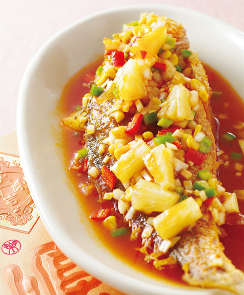 3. 将市售炸鱼放入大盘中,淋上作法2的五彩糖醋酱即可。