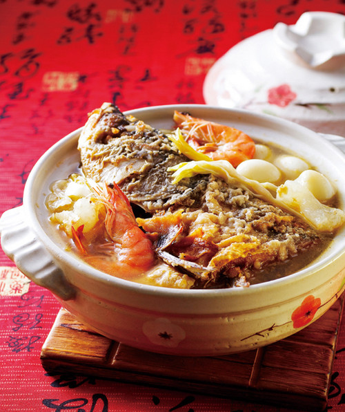 鲢鱼头1/2个(约500公克)、青蒜2根、香菇 2朵、大白菜1/2颗、姜20公克、红辣椒 1条、鱼板1小块、豆皮 6块、扁鱼2片、金针适量、鹌鹑蛋 10颗、蹄筋100公克、鲜虾6 尾、红葱酥1大匙