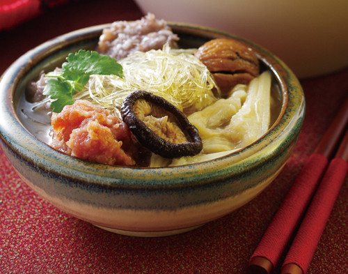芋头350公克、栗子20粒、笋丝100公克、黑木耳1片、大白菜200公克、猪脚5圈、干香菇3朵、市售炸排骨150公克、水翅(仿鱼翅) 100公克