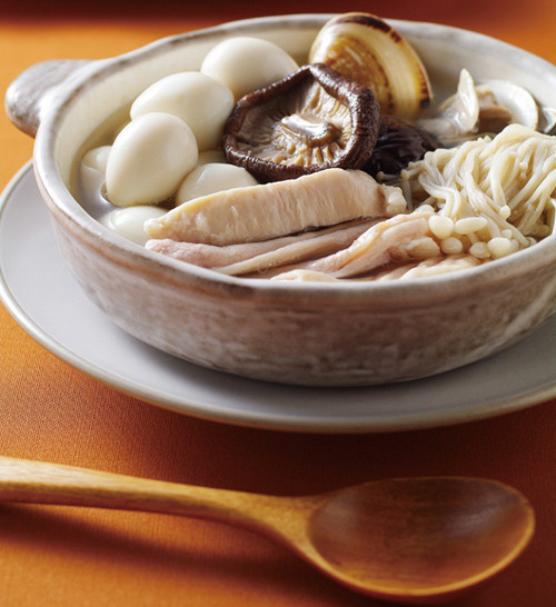 猪肚1个、蛤蜊6颗、金针菇1/2把、香菇5朵、姜片3片、葱段1根、白萝卜1/2条、鹌鹑蛋6颗、水400cc
