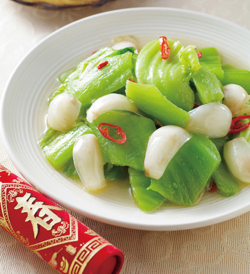 4.热锅,加入1大匙沙拉油,再加 入作法3的所有材料先爆香,加入作法1的芥菜心与所有的调味料,以中火煮约10分钟,再加入干百合以中火续煮3分钟炒匀即可。