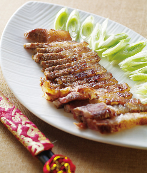 5. 将作法3煎好的咸猪肉平均切成长方块状后盛盘,并放上作法4的蒜苗片即完
