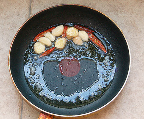5. 重起油锅,入蒜瓣,泡椒爆香。
