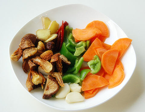 配料:香菇4朵,青辣椒1个,胡萝卜1小截,泡椒3个,蒜4瓣,姜4片,白酒2勺,盐适量,老抽半勺,香醋半勺,糖半勺,淀粉1勺