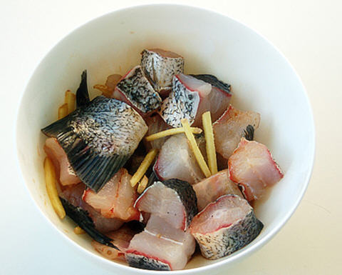 2. 草鱼切成小块。加2勺白酒,适量盐,姜丝拌匀腌制30分钟(时间久点更好)。1勺淀粉入小碗,清水拌匀。