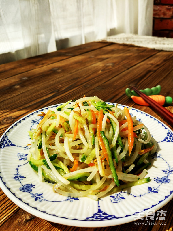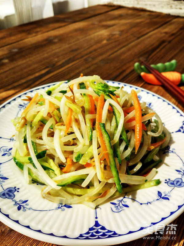 5.将豆芽,胡萝卜丝,黄瓜丝和香菜段放入拌菜盆,洒少许盐、辣椒油,香油,拌匀即可。也可以洒少许鸡粉提味。