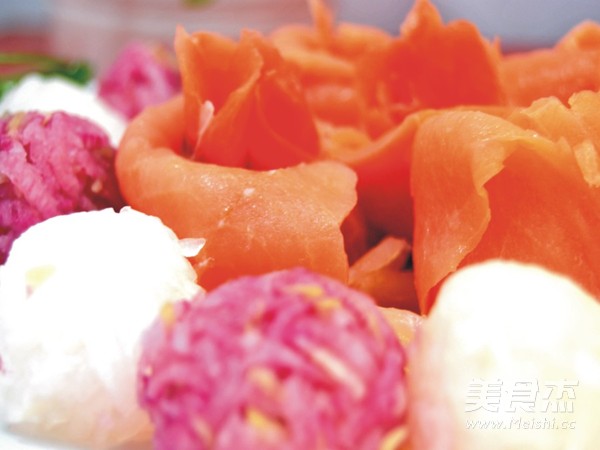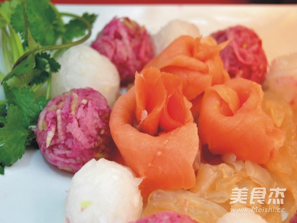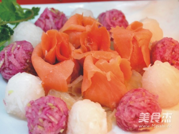 三文鱼中含有丰富的不饱和脂肪酸,能有效防治心血管疾病。所含的Ω-3脂肪酸更是防治老年痴呆和预防视力减退的功效。萝卜中含有丰富的消化酶,该消化酶不耐加热,所以萝卜适宜生吃。这是一道很有营养的,也很漂亮的美食,新鲜有弹性的三文鱼配上脆脆的海蜇和爽口的萝卜丝真是超级美味~春天到了,美食也像花儿一样绽放了。