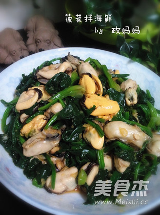 家常凉拌菜,菠菜与海虹,海蛎子,毛蛤蜊等小海鲜拌在一起,味道都很好吃,做法也很简单。 主料 菠菜250克 海蛎子100克 海虹100克 辅料 醋1勺 味极鲜酱油1勺 蚝油1勺 蒜泥适量 菠菜拌海鲜的做法 1.菠菜摘洗干净,切段。 2.将菠菜入锅焯水后用凉开水冲凉后,捞出适当挤干水分。 3.海蛎肉,海虹肉焯水,焯熟后取出沥干水分。 4.将菠菜,海鲜肉放入盆中,加入味极鲜酱油。 5.加入蚝油。 6.加入醋拌匀即可。 烹饪技巧 还可以加入一点香油,或者辣椒油拌匀,也很好吃。