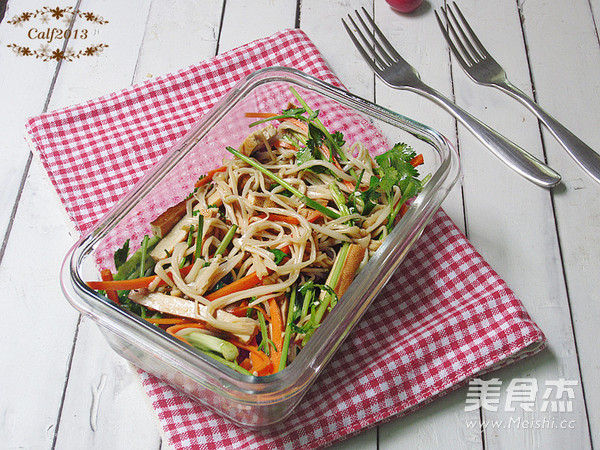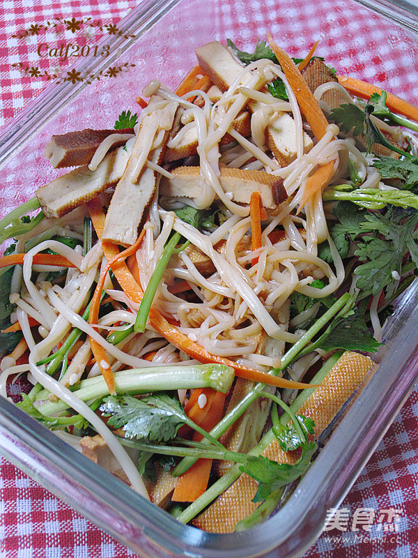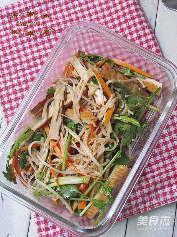 8.把香干、胡萝卜丝、金针菇、香菜放在容器上,放进2茶匙香油