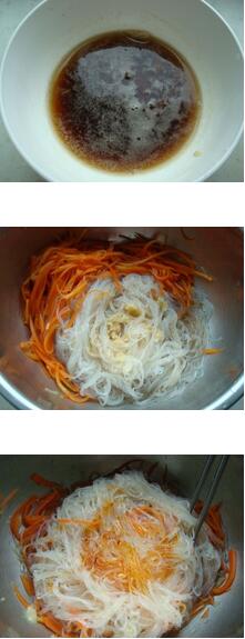 凉拌粉丝的材料:干粉丝,胡萝卜,红油 大蒜 生抽 米醋 盐 白糖 鸡精 凉拌粉丝的做法: 1.粉丝入沸水锅中焯熟泡软捞出过凉沥干水分,胡萝卜切成丝,越细越好,锅里焯一下,捞出,过凉沥干水分,大蒜去皮,捣成蒜泥 学做菜 的做法 2.用大蒜泥,白糖米醋盐 鸡精 调成汁 3.把粉丝和胡萝卜丝装在大碗里,加入调好的汁,拌均匀再加红油拌均匀就好了