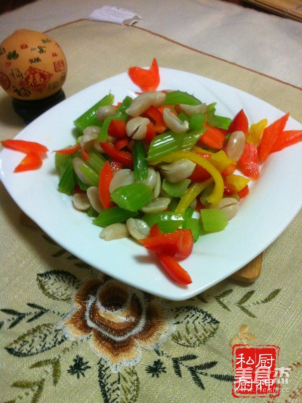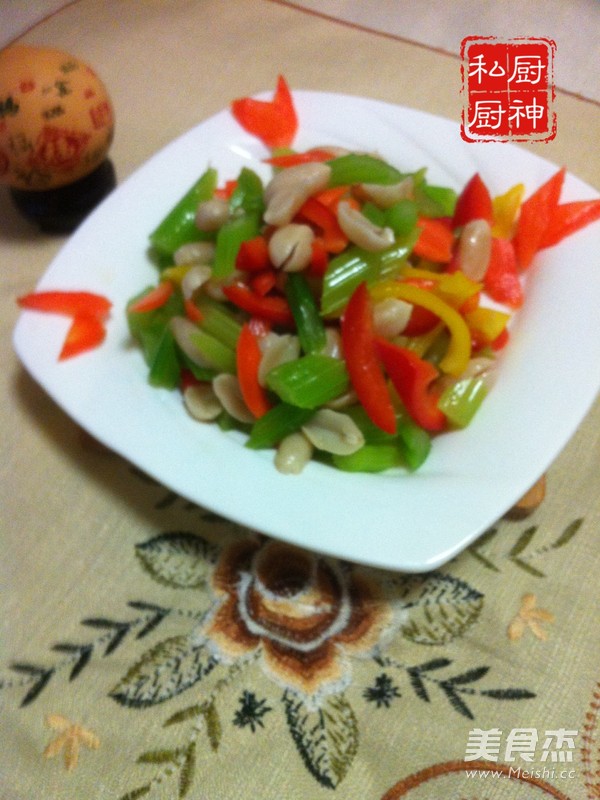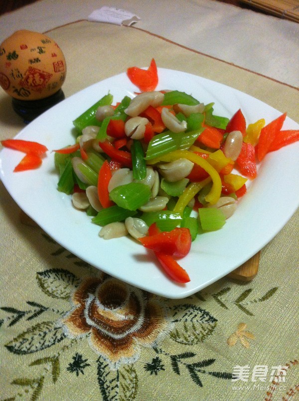 芹菜据有降血压降血脂降血糖等功效。 主料 花生仁(生)120克 柿子椒80克 芹菜300克 红萝卜40克 辅料 花椒8粒 盐3克 麻油2毫升 糖3克 香油2毫升 食用油适量 花生拌时蔬的做法 1.红萝卜洗净切片备用 2.红黄椒洗净去籽切斜条备用 3.芹菜洗净切斜片 4.芹菜焯花椒水备用 5.花生仁去皮煮熟 6.将所有食材调合在一起加盐糖麻油香油拌均即可 烹饪技巧 提示芹菜要焯花椒水。