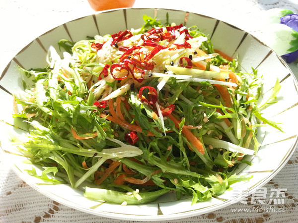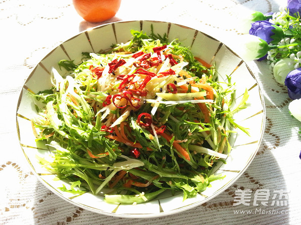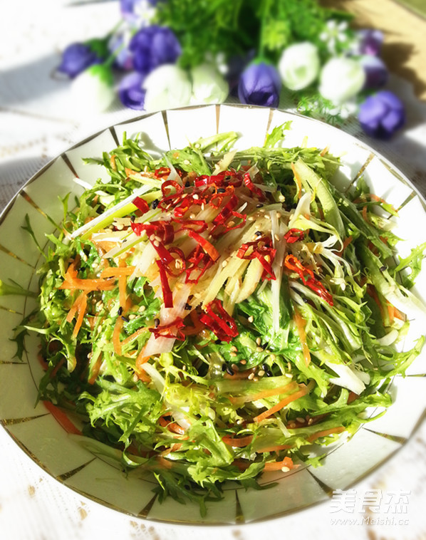 冬季干燥,容易引起上火,一盘脆脆绿绿的苦苣,既可以清火,又可以让久食肥甘油腻的人清清肠胃。 主料 苦苣40克 胡萝卜15克 辅料 盐2克 干辣椒1个 姜2克 葱白1小段 食用油3克 苹果醋3克 味精0.5克 熟芝麻(撒表面)2克 凉拌苦苣的做法 1.原料:苦苣、胡萝卜(葱、姜忘记拍了) 2.苦苣洗净后,切成段,胡萝卜切丝 3.将苦苣和胡萝卜混合,加入盐、苹果醋、味精,拌匀后装盘 4.干辣椒横切成圆圈状,也可以切成丝,姜切丝,葱白切丝 5.分别摆在苦苣上,锅内烧热油,油热后淋在葱、姜丝上。最后撒上熟芝麻(没有,也可以不用) 6.成品 7.成品 烹饪技巧 这道菜虽然有干辣椒在内,但并不辣。干辣椒也可以在热油中炸一下再淋在菜上,这样辣味要重一些。