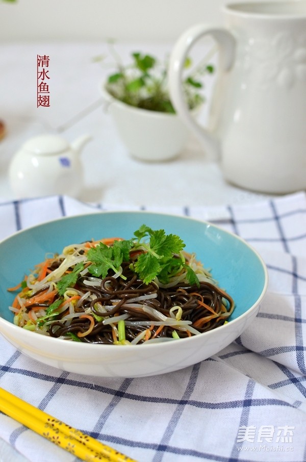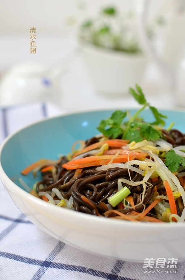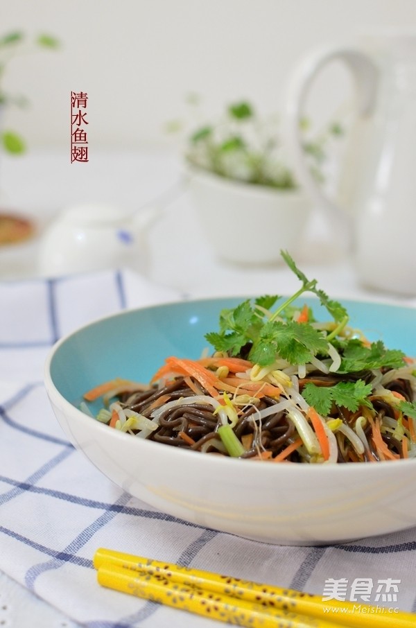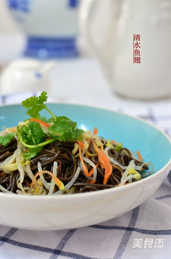 3.蕨根粉、胡萝卜、丝绿豆菜、蒜泥、尖椒碎、香菜一起放入小盆中,倒醋,加盐 将花椒油倒入,根据个人喜好挤上青芥末,拌匀即可。