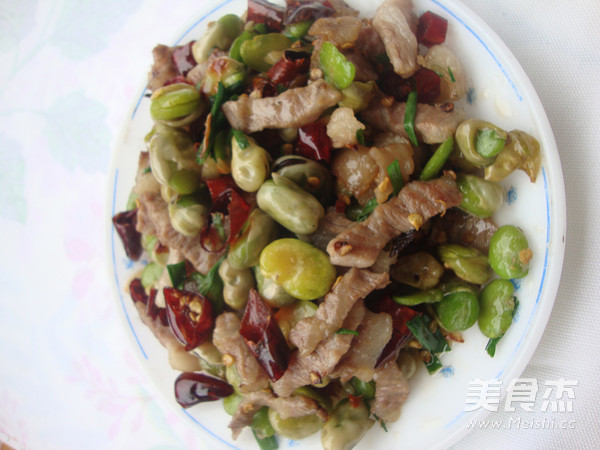 4.炒锅洗净,待锅烧热后,加入少许油,肥肉先下锅,炸至出油,再加入瘦肉,待瘦肉炒熟后,把肉捞出,油留在锅中;下入香蒜、辣椒炒香再放入蚕豆煸炒,煸炒至蚕豆开始变绿倒入炒好的肉,加适量盐,再蚕豆完全变绿表示已经炒熟,起锅,即可了。