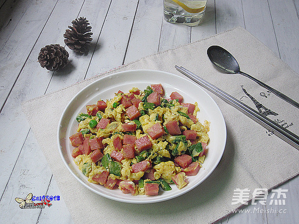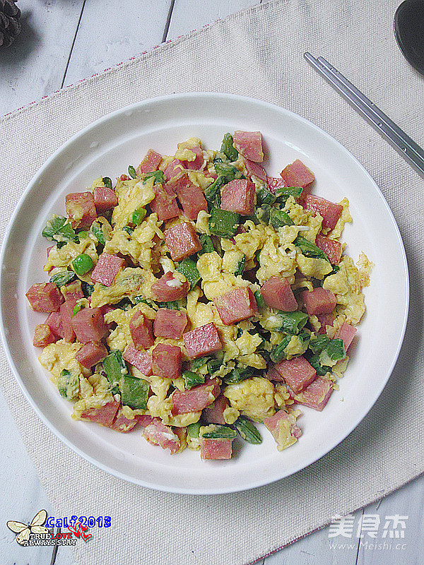 哈哈。。我家的小农场现在盛产是甜豆和生菜!我天天都吃这种菜,吃腻了再转其它的菜菜,今天我拿甜豆加火腿炒了个蛋吃! 主料 甜豆100克 火腿1块 鸡蛋3个 辅料 盐4克 花生油3茶匙 火腿炒蛋的做法 1.准备好食材 2.甜豆去豆筋 3.甜豆洗净,切粒 4.火腿洗净,切粒 5.鸡蛋打出加放少许盐,搅拌均匀 6.热油锅,翻炒甜豆 7.加入少许盐调味 8.甜豆炒香后,加入火腿粒 9.火腿炒熟后,加入蛋液迅速翻炒,至蛋液熟透即可 烹饪技巧 不配甜豆炒也行,配其他菜菜也不错的