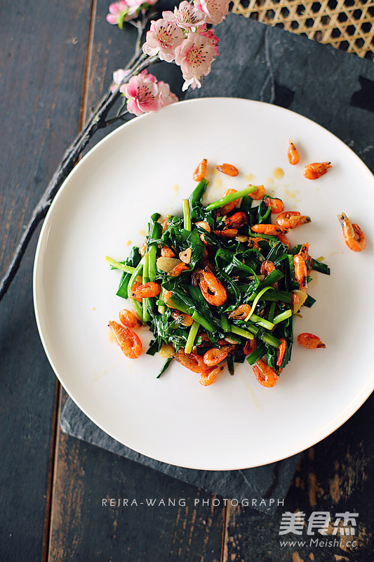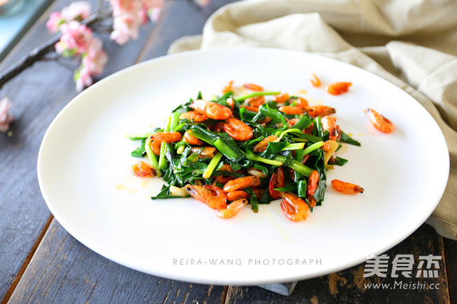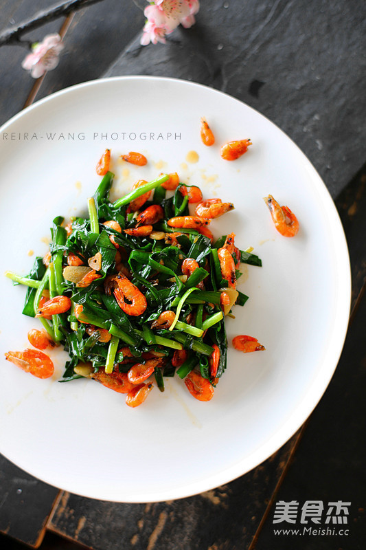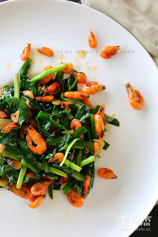 7.韭菜略软时,倒入河虾大火翻炒,加盐调味即可出锅。