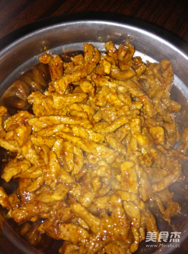 猪肉一定要选择嫩的,如果后肘肉也可以在炒之前,将肉丝加入一点淀粉,加一点水抓匀,再炒这样肉会嫩 主料 猪肉(瘦)300克 辅料 花生油适量 五香面1勺 生抽3勺 辣椒面1大勺 食用油适量 炒辣肉丝的做法 1.里脊肉一大块,因为今天没买到里脊肉,只买了块颈背肉,一定要用嫩的 2.肉洗净切丝 3.锅中倒油,五成热下入肉丝翻炒,中火 4.肉丝超出水分加入五香粉改成小火翻炒 5.翻炒均匀加入生抽翻炒 6.然后加入辣椒粉炒,慢慢收汁,少留点汤汁,加入味精出锅 7.有香又辣的肉丝好好吃
