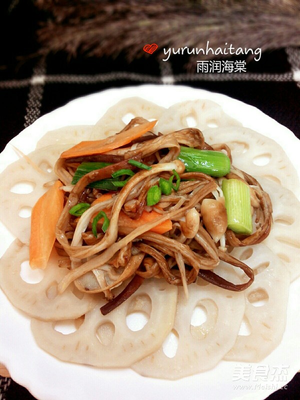 10.先将莲藕片摆入盘中,再将金针菇放在中间即可