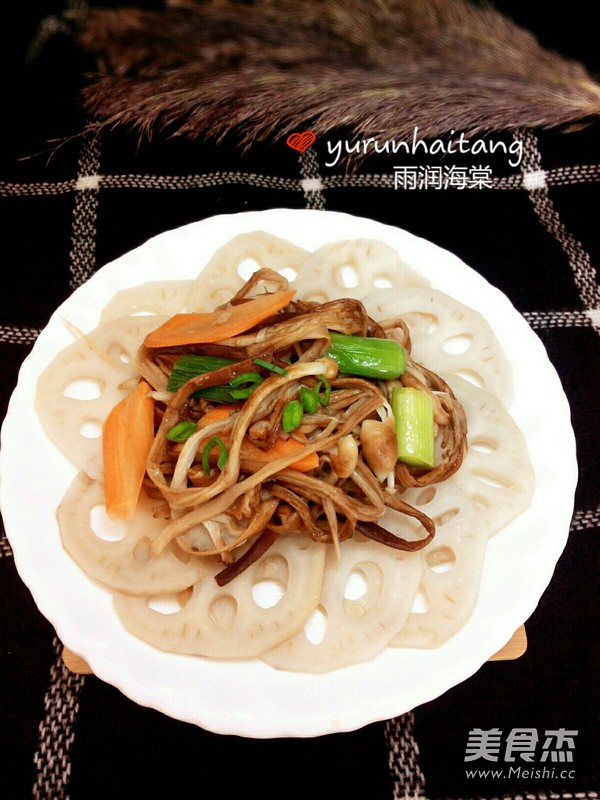 莲藕是一种营养价值很高的低脂食品,可以生吃,也可以蒸、炒、炖汤。金针菇对生长发育大有益处 ,两者结合在一起营养更加全面,家人很喜欢呢!