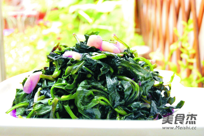 3.起锅,锅热后倒油,放大蒜爆香后,放观音菜煸炒