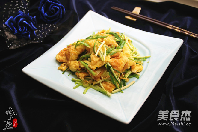 蒜苗含有丰富的维生素C以及蛋白质、胡萝卜素、硫胺素、核黄素等营养成分。蒜苗对于心脑血管有一定的保护作用,可预防血栓的形成,同时还能保护肝脏。 主料 蒜苗150克 鸡蛋4个 辅料 植物油2汤匙 葱10克 食盐3克 蒜苗炒鸡蛋的做法 1.蒜苗择洗干净,切成寸断 2.鸡蛋加一半的盐打散 3.锅加油烧热,下入蛋液摊开 4.至蛋液凝固,炒成块,加入葱花炒香 5.在下入蒜苗,盐 6.翻炒均匀,至蒜苗稍变软即可盛出装盘 烹饪技巧 蒜苗炒制时间不要过长,稍变软即可
