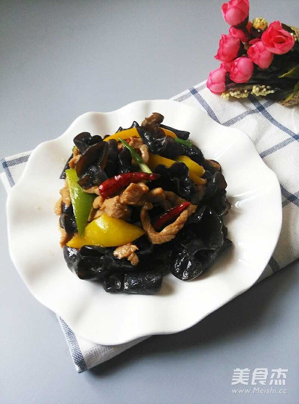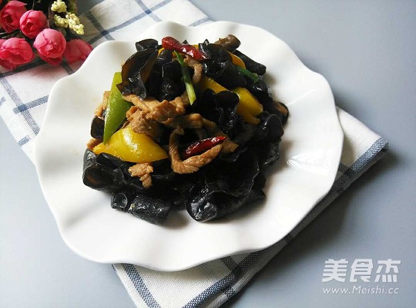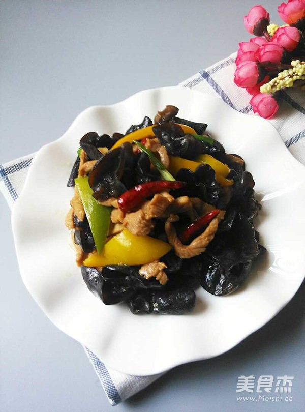 4.倒入木耳和彩椒,大概翻炒8分钟