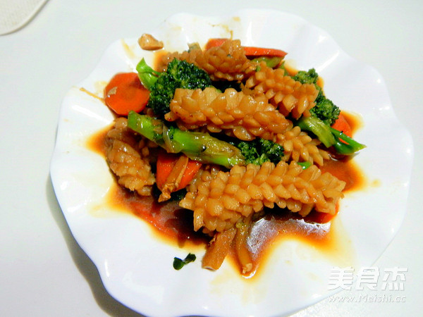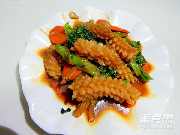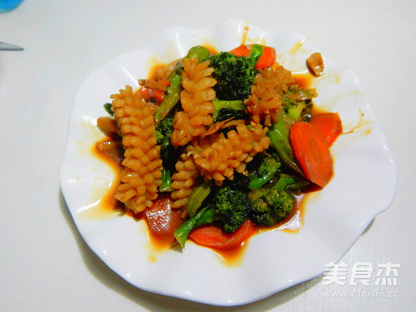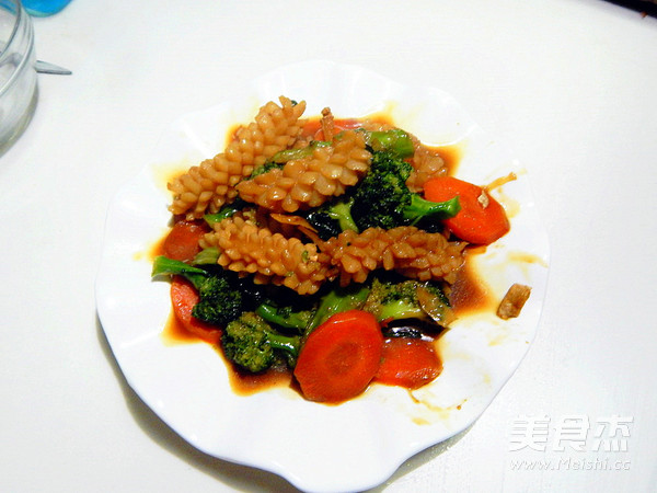 前几天去超市买到的鱿鱼花,头一次吃这个东西 主料 鱿鱼300克 西兰花40克 胡萝卜半根 辅料 耗油4克 生抽4克 淀粉1克 水50克 料酒3克 西兰花炒鱿鱼花的做法 1.西兰花及胡萝卜清洗 2.锅里倒入水倒入盐烧开 3.然后加入西兰花及胡萝卜烫一分钟 4.买好的鱿鱼花 5.生抽 耗油 6.加水加淀粉搅拌均匀 7.锅里加入油加入葱姜炒香 8.过完水的 9.加入鱿鱼花炒 10.大火暴炒几分钟,加入料酒去醒 11.然后在次炒五分钟 12.加入过完水的菜 13.快速翻匀 14.加入调好的料汁 15.炖几分钟 16.炖至入味加入鸡精 17.炒好装盘 烹饪技巧 鱿鱼多放点料酒炒能去那个醒味