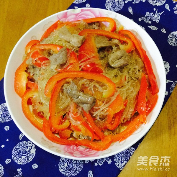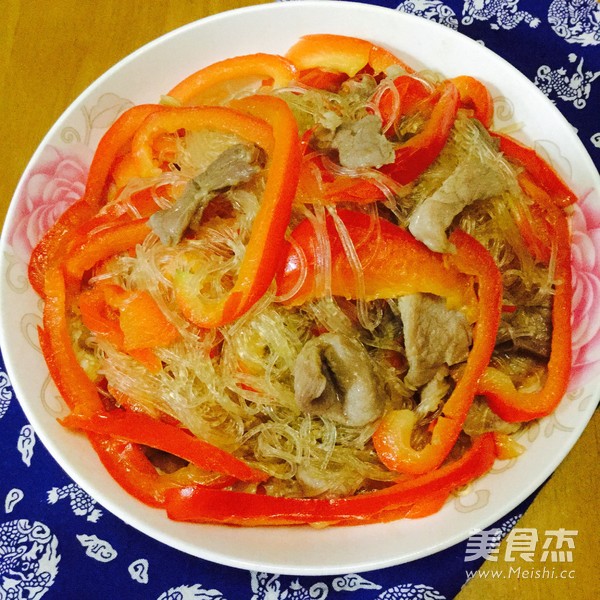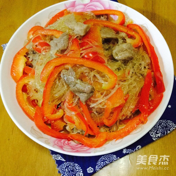 喜欢彩椒的甜味 主料 彩椒100克 粉丝50克 瘦肉100克 辅料 油15克 盐5克 蚝油5克 彩椒粉丝的做法 1.起油锅 2.加入肉片,肉片预先用油盐和蚝油腌10分钟 3.加入适量清水 4.加入彩椒,盖上盖,煮3分钟 5.再加入清水 6.加入粉丝(粉丝预先用清水浸泡至软),加入蚝油,煮1分钟边好 烹饪技巧 因为粉丝比较吸水,在煮的时候多放些水