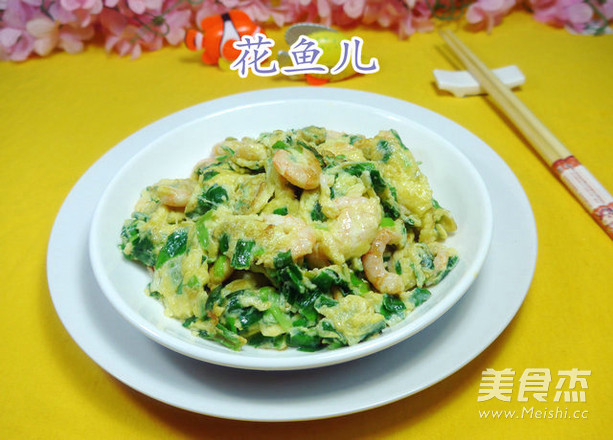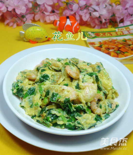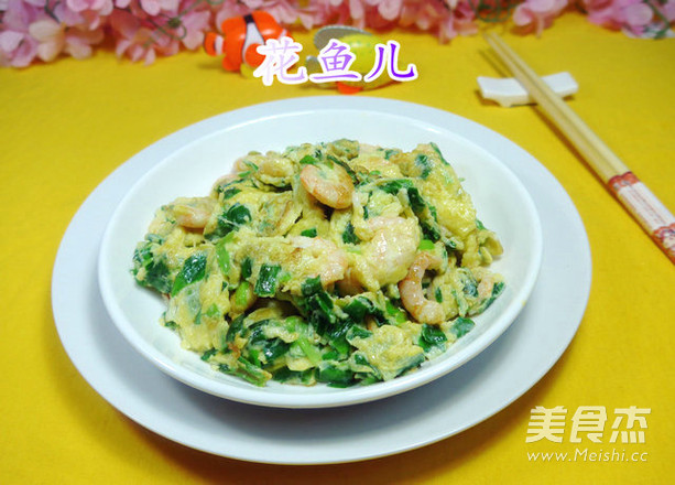 5.接着,合入切好的韭菜和虾肉拌匀。